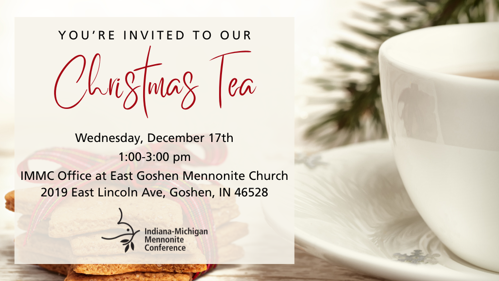 If you are in the Goshen area on Wednesday, December 17, we’d love for you to join us at our office for a Christmas Tea. We will enjoy refreshments and one another’s company before the holidays as a way to say thank you for all the ways you participate in IMMC and to stay connected with one another. We will gather from 1-3pm in the Fellowship Hall of East Goshen Mennonite Church, where the IMMC office is located, at 2019 E Lincoln Ave, Goshen.