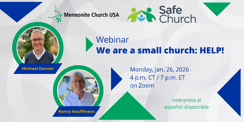 The webinar will look at the unique opportunities for and challenges of being a small church – and explore MC USA’s Safe Church policies and practices for smallish congregations. The webinar will feature Michael Danner, associate executive director for Church Vitality, with Nancy Kauffmann, senior consultant for Church Safety, as host.